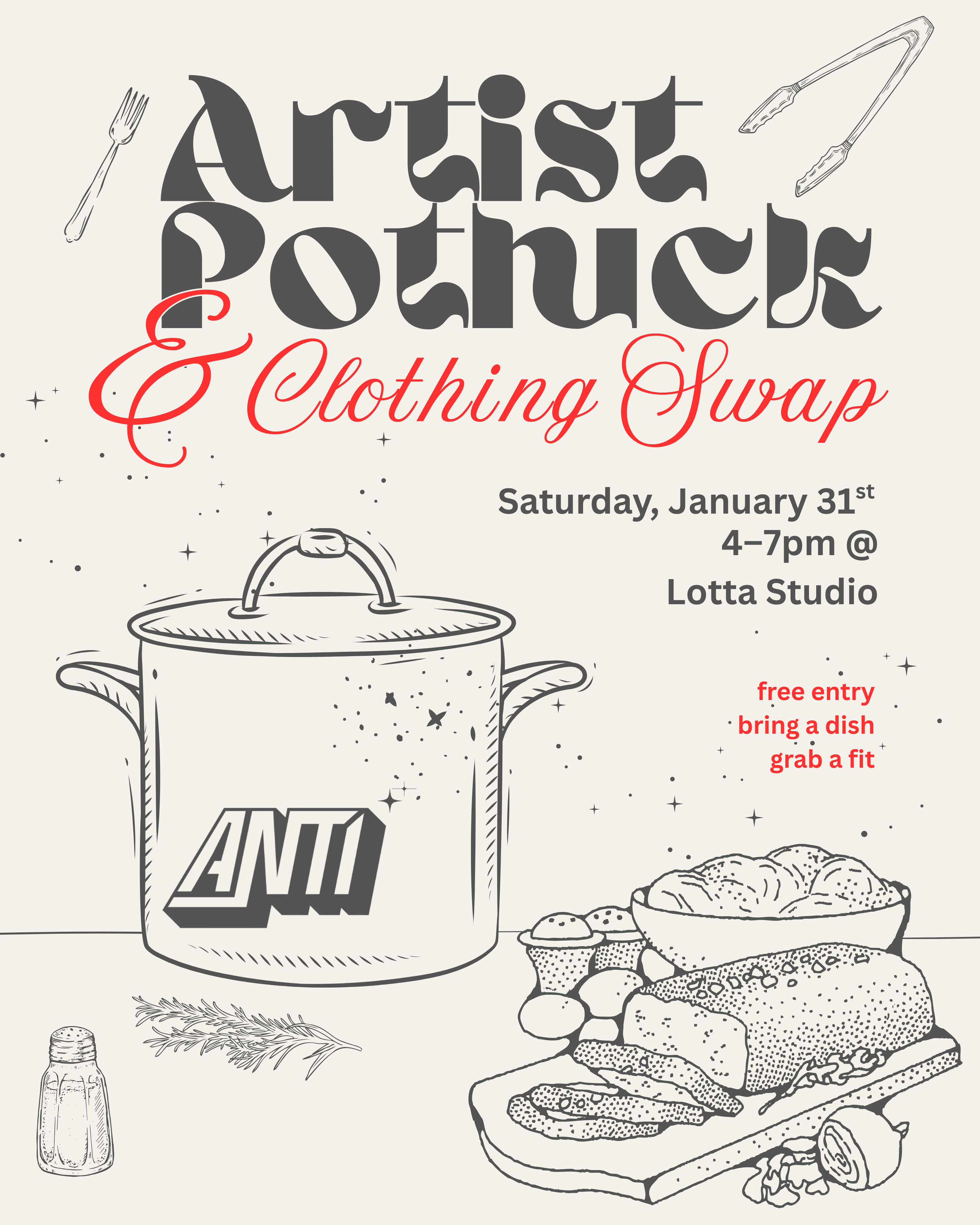 The Anti: Artist potluck & clothing swap is a space for artists to come together, be in community, & share recourses! pull up to @lottastudio January 31st for the first one. Grab a Meal, Take what you need 🍛👕
